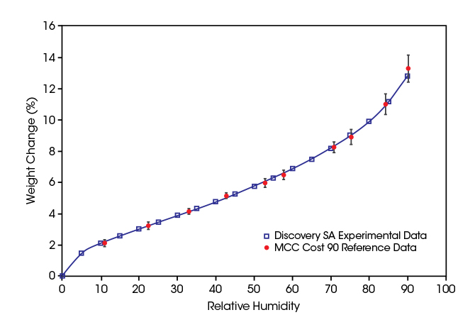 Microcrystalline cellulose (MCC) is a material with well characterized humidity sorption properties. In the plot below, humidity sorption data on MCC measured with the QHM-SA100 are plotted over RH. The red symbols in the plot are published, certified reference values from a COST 90 inter-laboratory test. The data measured with the QHM-SA100 are in agreement with the certified values within their confidence intervals over the whole RH range.