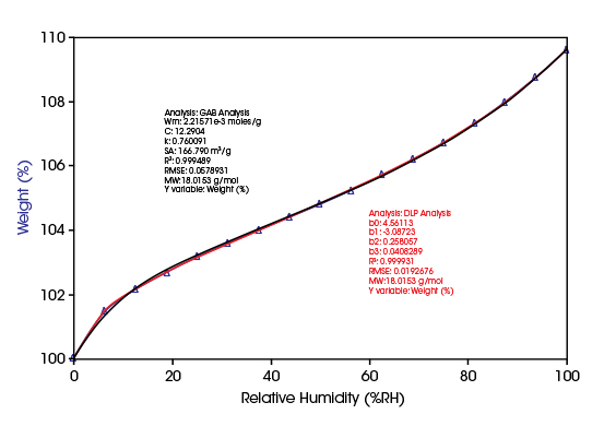 Starch is one of the most important bio-polymer components of cereals, which determines to a great extent their hygroscopic properties. Starch is also used in many food products, whose preservation depends essentially on its humidity sorption properties. Owing to its versatile properties and variability, starch is also used in the production of packaging materials, biotechnology, fragrance, textile, and pharmaceutical products.In the diagram below, the ab- and desorption of water vapor in corn starch measured at 25°C is plotted as function of RH. The continuous progressing sorption isotherm type II and the relatively small hysteresis are characteristic for corn starch.