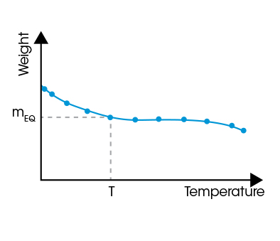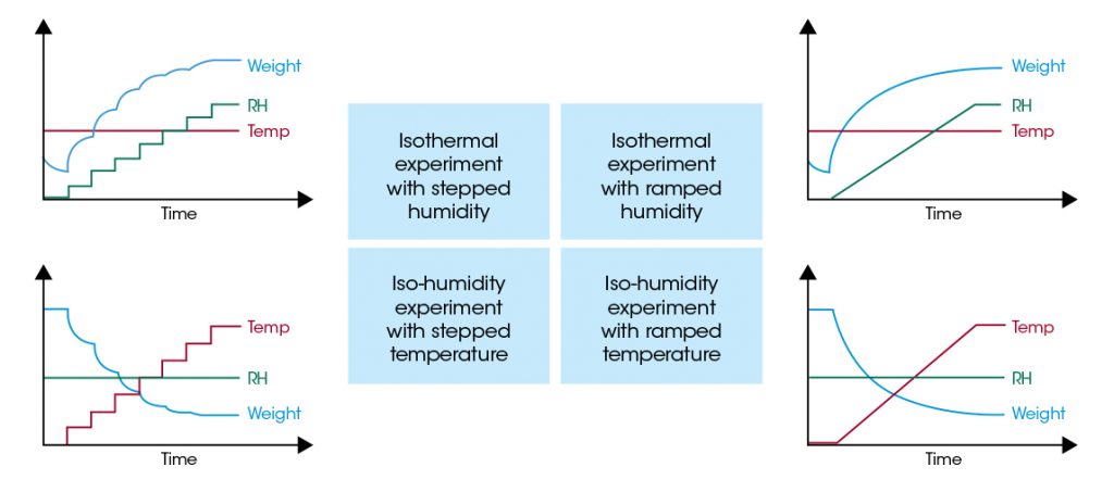 Sorption analysis quantifies the interaction of a sample material with humidity. For sorption analysis, the weight of the sample material is measured under controlled temperature (T) and relative humidity (RH) conditions. One of these properties – T or RH – is held constant while the other is changed either stepwise or continuously during a test. The table below provides an overview of the four flexible controlling modes which can be applied for performing sorption measurements with the QHM-SA100.