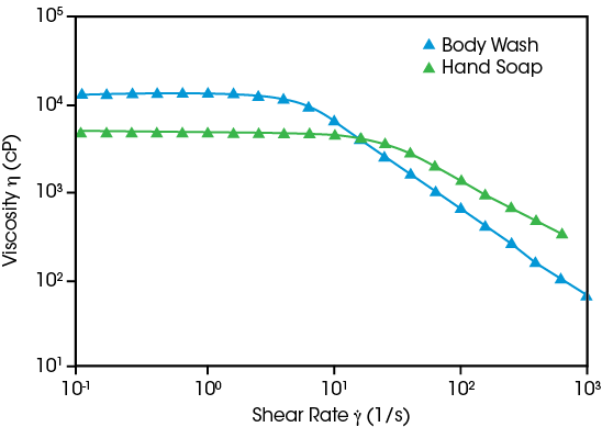 The liquid soaps above show similar viscosities at a medium shear rate but expanding the measurement range shows key differences. Compared to hand soap, body wash shows higher zero-shear viscosity, flowing more slowly at rest. At high rates, body wash is less viscous, more easily spread. Basic viscometers may not detect these differences, but consumers are highly attuned to flow behavior and instinctively reject a body wash that drips off the washcloth or a hand soap that doesn’t coat properly.