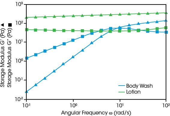 While viscosity measurements describe flow behavior, oscillatory measurements dive deeper into the underlying microstructure. Frequency Sweep measurements show body wash to be a viscoelastic liquid which flows after a short time as indicated by the frequency of the crossover of Storage Modulus G’ and Loss Modulus G”. Lotion shows Storage Modulus dominating across frequency, indicating an elastic structure that maintains emulsion stability over time.