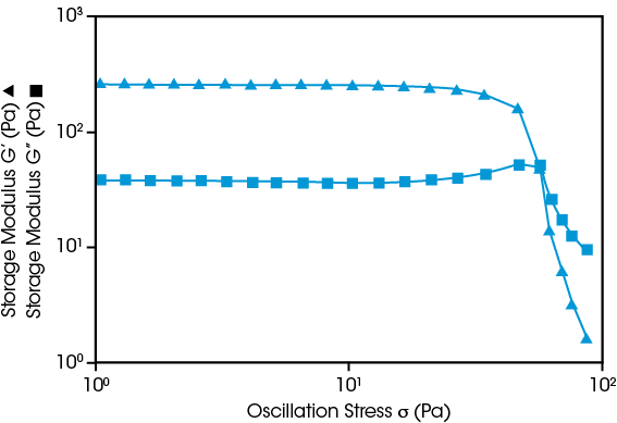 Oscillatory measurements of lotion in the linear viscoelastic region show elastic behavior reflecting the emulsion stability, but this structure must be readily deformed in order to dispense and apply to the skin. Increasing the applied oscillatory stress shows the Storage Modulus break down and drop below Loss Modulus, transitioning for solid-like to liquid like behavior. The stress required for this change represents a yield stress, which should be optimized to ensure successful dispensing from packaging.