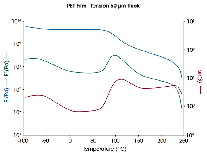 Axial DMA tests on thin films requires maintaining the axial force above the oscillation force to hold the sample in tension throughout the test. This capability is highlighted in the plot showing a temperature ramp on 50μm thick PET film tested using tension geometry over a temperature range of -100 °C to 250 °C. Three major transitions are observed: a beta glass transition at -80°C, an alpha glass transition at about 111 °C, and melting at 236 °C. The data reveal a semi-crystalline structure with two amorphous relaxations and the DHR’s force-tracking capabilities in such tests.