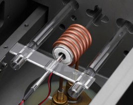 In the quenching mode the sample, solid or hollow, is inductively heated to a temperature plateau and is then cooled at an user-defined (linear or exponential) cooling rate. The inductive heating with constant sinus frequency is power controlled by amplitude adjustment for superior temperature homogeneity in the sample. The phase transformation occurring in the continous cooling process or in the isothermal dwell, with or without compression/tensile stress, is indicated by the measured change in length. An array of cooling or isothermal curves represents a continous-cooling-transformation (CCT) diagram or an isothermal time-temperature-transformation (TTT) diagram, respectively. TRW-DT 805A represents today the benchmark for determining these dimensional changes and phase transitions. Operating from -160°C up to 1700°C (in two different furnace configurations) with peak heating rates of up to 4000°C/s and peak cooling rates of 4000°C/s, can closely simulate the material response for any production or heat treatment process. TRW-DT805A allow using a choice of inert and reducing gases as cooling gas. Particularly helium is an effective cooling gas that provides a homogeneous temperature distribution in the metallic sample.