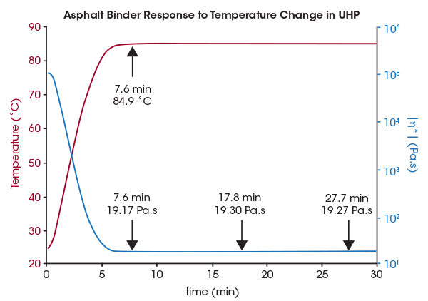 The true test of any rheometer temperature control system is to compare sample response to the reported system temperature. This evaluation is especially important for a combined lower Peltier device with intimate contact heating and an upper non-contact heating device. In this situation, the top plate heats more slowly than the bottom plate. Because the top and bottom plates heat at different rates, the sample temperature differs greatly from the reported system temperature. In competitive systems, the sample response lags the temperature profile, requiring the user to determine system-based thermal equilibration times and program long delays. This issue is eliminated with Taraws’s unique UHP design, by continuously controlling and matching the upper and lower plate temperatures. This accurate response is demonstrated in the following figure with simple oscillation time sweep measurements.