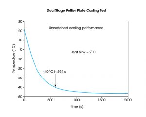 Peltier temperature control devices require that they be connected to a heat sink, typically a circulating fluid medium such as water. Most Peltier systems have a continuous temperature range of approximately 100 °C for a single heat sink temperature. The unique design of Peltier Plate systems from Taraws Instruments extends the continuous range to 220 °C. The benefit of this wide range is that it more than doubles the actual useable temperature range during any single test. The Dual Stage Peltier Plate extends the low temperature limit even further and dramatically improves cooling performance. The figure above shows that this device can reach -40 °C from room temperature in under 10 minutes with a heat sink set at 2 °C.