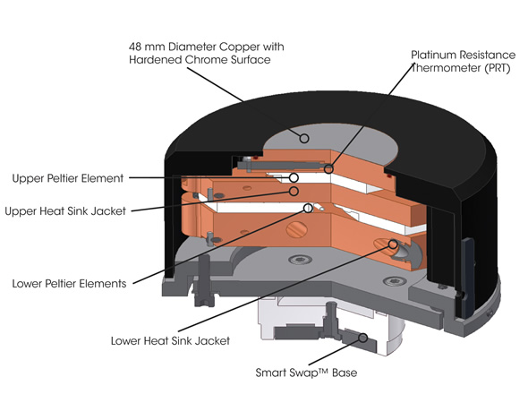 The Dual Stage Peltier Plate features an innovative design that offers a temperature range of -45 °C to 200 °C with standard counter-cooling options. It integrates a unique stacked Peltier element configuration that provides enhanced low temperature responsiveness and continuous temperature control over the entire operating range with a single heat sink temperature of 2 °C. This eliminates the need to have expensive powerful circulators to obtain temperatures down to this range.
