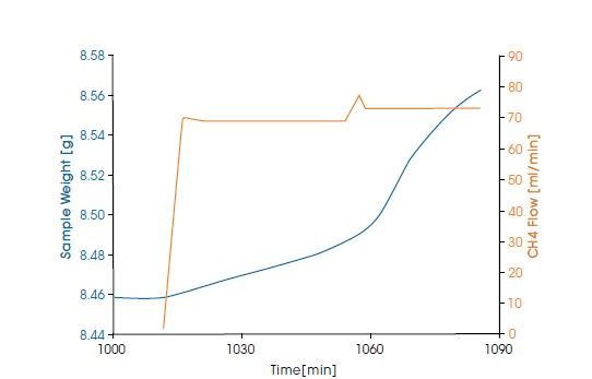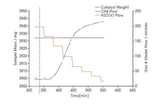 In the lower figure, the starting of coking on a commercial catalyst at 700°C and 20 bar is measured in a steam / CH4 mixture at flow rate of 70 ml/min. An increase in the coking rate was observed when the CH4 flow rate was increased to 73 ml/min, with a constant steam flow rate.