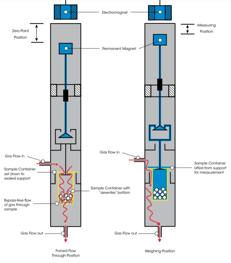 The sample is weighed over specified intervals of time by raising the MSB into measuring position, which lifts the sample container from the supports. Once the weight measurement is completed, the sample container is returned to the rest position to start the process again.