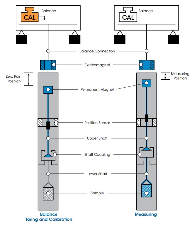 within the sample cell.An external electromagnet is controlled to attract the internal permanent magnet. This raises the internal suspension magnet and engages the load coupling and, as a result, raises the sample crucible. The electromagnet control continues to apply attractive force until the system reaches a constant measuring point height.