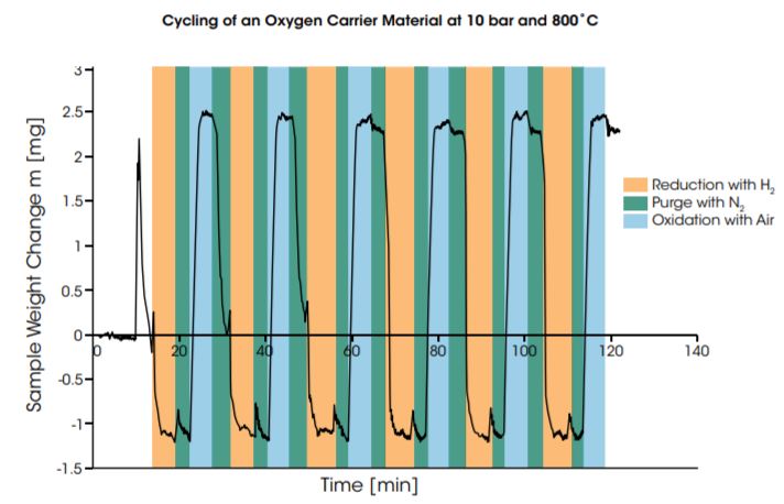 The diagram below shows the result of cycling of an oxygen carrier material at 10 bar and 800°C. The material is reduced in humidified H2 and oxidized in dry air. The weight changes recorded in the redox cycles are fairly constant and amount to approximately 9% of the starting sample weight.