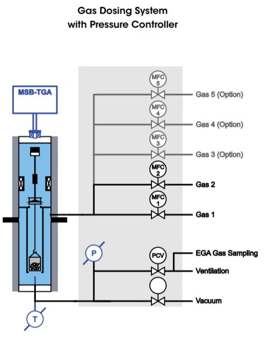 Each dosing system includes two mass flow controllers (MFC 1, MFC 2) for dosing pure gas or blending gas mixtures and dosing into the TGA reactor, an accurate pressure sensor (P), a PID controller, a pressure controlling valve (PCV) in the gas flow at the reactor exit, and a gas sampling connection for evolved gas analysis (EGA). Additional gas lines with mass flow controllers are optional.