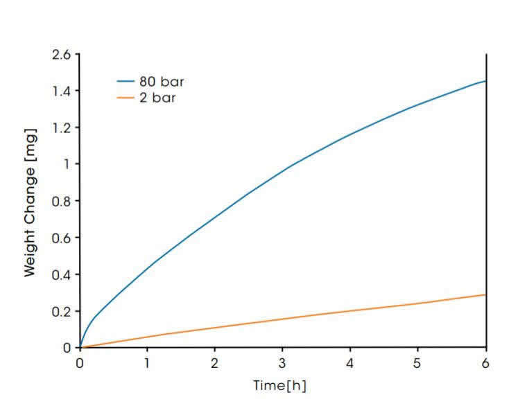 In the diagram below, the weight gain of a high performance Inconel®* alloy C-276 in air at 1000°C and at two different pressures of 2 and 80 bar is shown. The alloy samples had a starting mass of 89 mg and a surface area of 0.47 cm2. The weight increases observed are a result of oxidation of the metal alloy surface. The corrosion rate is 5 times higher at high pressure. The weight change at high pressure seems to approach saturation which indicates the formation of a stable oxidic layer. The surface area specific oxidative weight gain after 6 hours was 610 μg/cm2 at 2 bar and 3080 μg/cm2 at 80 bar.