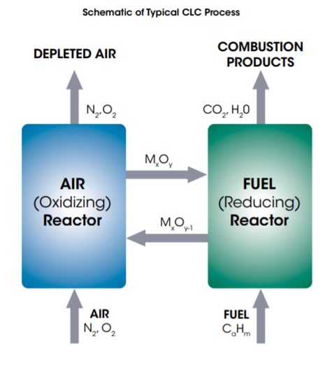 In CLC systems, oxygen is introduced via oxidation-reduction cycling of an oxygen carrier material. The oxygen carrier is usually a solid, metal-based compound. In a typical CLC process, combustion is split into separate reduction and oxidation reactors as shown in the schematic below. The metal oxide supplies oxygen for combustion and is reduced by the fuel in the fuel reactor, which is operated at elevated temperature.