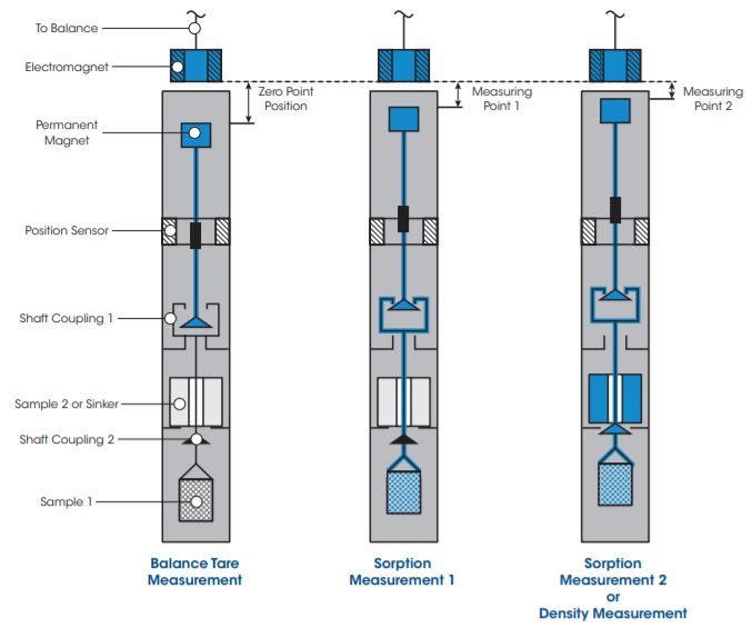 - Measuring Point 1: The permanent magnet is raised, engaging the first coupling where the weight of the first reactive sample (adsorbent, catalyst, organic materials, etc.) is determined for sorption measurement 1.