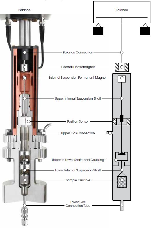 As shown in the figure above, the MSB design includes a shaft load coupling. When the electromagnet is energized, it attracts the permanent magnet that is connected to the upper shaft. The upper shaft lifts upward, engages the coupling, and raises the crucible to the measuring point to make the weight measurement. At any time during the experiment, the permanent suspension magnet can be moved downward to decouple from the sample crucible.