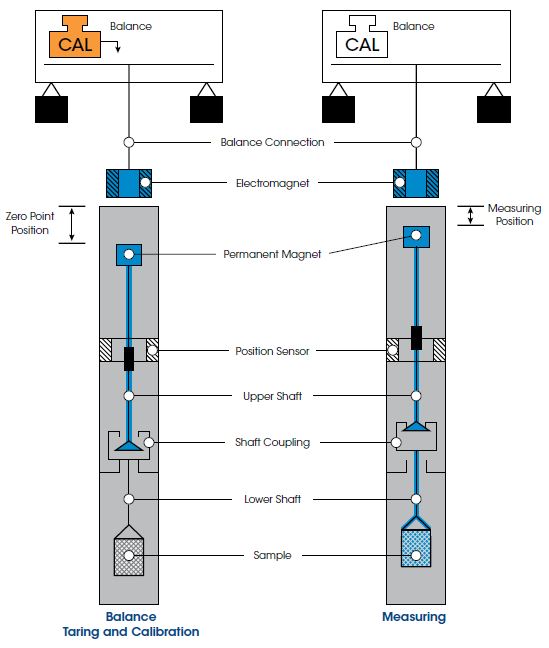 The second coupling and sample position creates a total of three vertical positions to which the MSB is controlled. These include the Zero Point, or Tare position, Measuring Point 1, and Measuring Point 2. This capability is demonstrated through a series of schematic diagrams in the figure above follows: