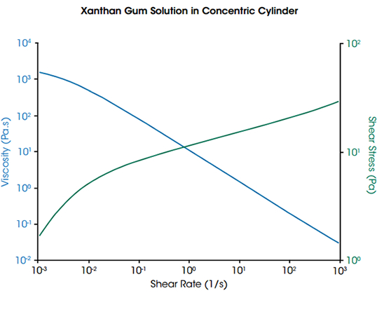 Concentric cylinder geometries are useful for gathering viscosity flow curve information over a wide range of shear rates. An example is shown in the figure for a xanthan gum solution. Five decades of viscosity are easily obtained over six decades of shear rate. This system is also a powerful alternative to parallel plate or cone and plate geometries for materials with limited stability or prone to edge failure or rapid solvent evaporation.