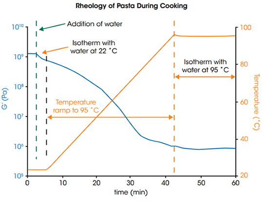 The Torsion Immersion Cell can be used for various food applications such as cooking of pasta. In this example, a piece of fettuccini pasta was tested using an oscillatory time sweep test at a frequency of 6.28 rad/s and temperature of 22 °C. Data were collected on the dry sample for 2.5 min to establish a baseline storage modulus G’. Water was added after 2.5 min and the effect of the moisture is seen immediately as a decrease in the G’. At 5 min. G’ was monitored as temperature was ramped to 95 °C and held isothermally. As the pasta cooks the modulus drops about three decades and then levels out when cooking is complete.