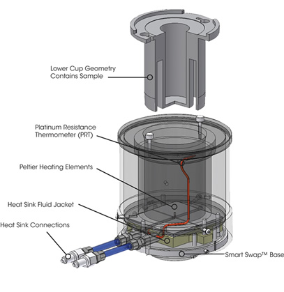 The Peltier Concentric Cylinder system offers a temperature range of -20 °C to 150 °C, with a maximum heating rate up to 13 °C/min. Four Peltier heating elements are placed in intimate contact with a lower cup geometry held in place by an insulated jacket. The unique patented design(1) of the lower geometry provides fast and efficient heat transfer up the walls of the cup. A platinum resistance thermometer (PRT) is placed close to the top of the cup ensuring accurate temperature measurement and control. The maximum controllable heating rate will depend on heat sink fluid temperature, circulator flow rate and cooling/heating capacity, and viscosity of heat sink fluid. (1) U.S. Patent # 6,588,254