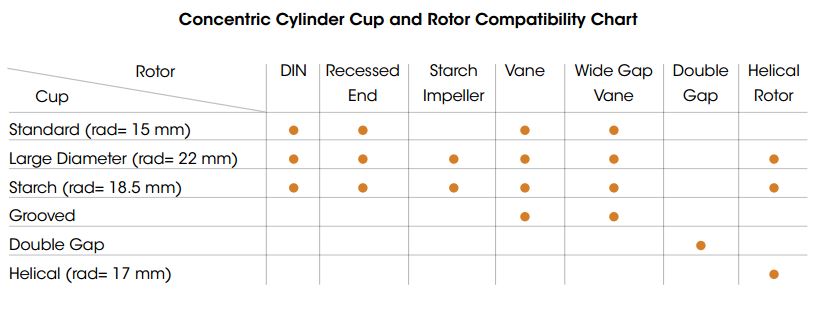 Specialty geometries include various vanes, helical, and starch pasting impeller rotors, as well as large diameter and grooved cups. These special concentric cylinder geometries are very valuable for characterizing dispersions with limited stability, preventing error from slip at the material/geometry interface, and for bulk materials with larger particulates. Vane geometries are available in both a 14 mm and 7.5 mm radius. The large diameter cup has a radius of 22 mm. The helical and impeller rotor and cup keep a sample mixed or particles suspended during shearing.