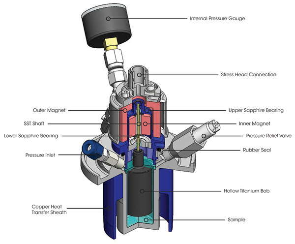The Pressure Cell Accessory is used with the Peltier Concentric Cylinder jacket or Electrically Heated Concentric Cylinder jacket. The sealed and pressurized volume is contained within a stainless steel cup to withstand high pressures and is surrounded by a copper sheath for optimal heat transfer. Also connected to the cup are the pressure inlet, internal pressure gauge, and pressure relief valve. An outer magnet assembly is attached to the rheometer drive shaft and houses strong rare earth magnets. The rotor assembly houses the inner magnet which couples to, and is levitated by, the outer magnet assembly and drives the hollow titanium cylindrical rotor. The rotor shaft is made from low friction Titanium nitride-coated stainless steel and is supported above and below by precision sapphire bearings. This innovative high-powered magnetic coupling and low-friction bearing design allows for both steady shear and dynamic measurements.