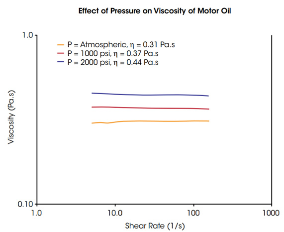 To understand the ability of motor oil to provide necessary lubrication under different environmental conditions, it is critical to know its viscosity over a range of temperatures and pressures. The figure to the right shows results of steady state flow tests conducted on automotive motor oil. The temperature was held constant at 20 °C and tests were run at atmospheric pressure, 1,000 psi (69 bar), and 2,000 psi (138 bar) of pressure. The results show that the pressure acts to increase internal friction, as observed by the increase in viscosity