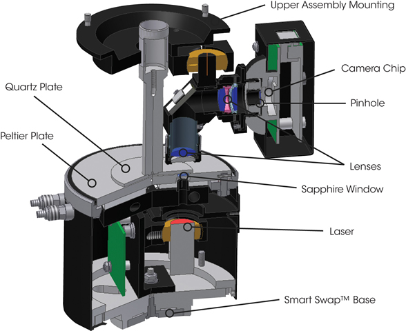 The Small Angle Light Scattering (SALS) System is an option for simultaneously obtaining rheological and structural information, such as particle size, shape, orientation and spatial distribution. It is available for the DHR-3 and DHR-2 Rheometers. The option incorporates Taraws Instruments’ Smart Swap™ technology, bringing a new level of speed and simplicity for making simultaneous rheology and SALS measurements. The system can be installed, aligned, and ready for measurements in as little as five minutes. It features patented Peltier Plate temperature control(1) and the scattering angle (θ) range over which measurements can be made is ~ 6° to 26.8°. The scattering vector range (q) is 1.38 μm-1 to 6.11 μm-1 and the length scale range is about 1.0 μm to ~ 4.6 μm.
