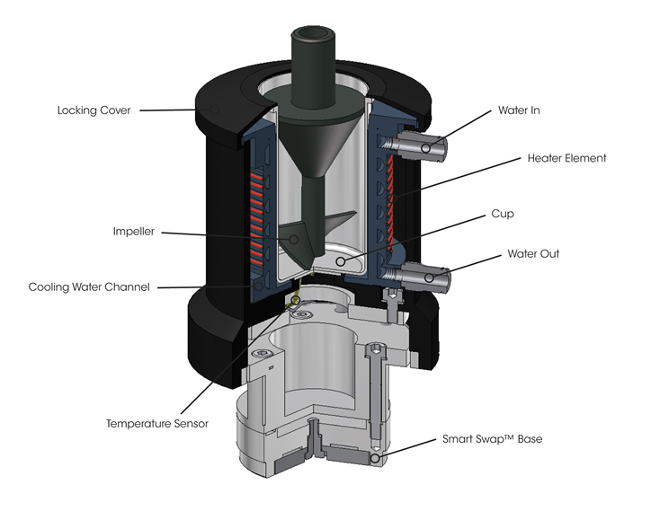 The SPC consists of the cell jacket, an impeller, and aluminum cup with locking cover. The cell jacket houses a heating coil and liquid cooling channel, which surrounds the Aluminum cup for fast heating and cooling. A Platinum Resistance Thermometer (PRT) is located in intimate contact with the bottom of the cup for precise and accurate sample temperature control. The impeller is designed with blades at the bottom for sample mixing. Solvent loss is minimized via a conical ring at the top of the rotor, which acts to condense water (or other solvents) that vaporizes during heating, and return it to the bulk sample.