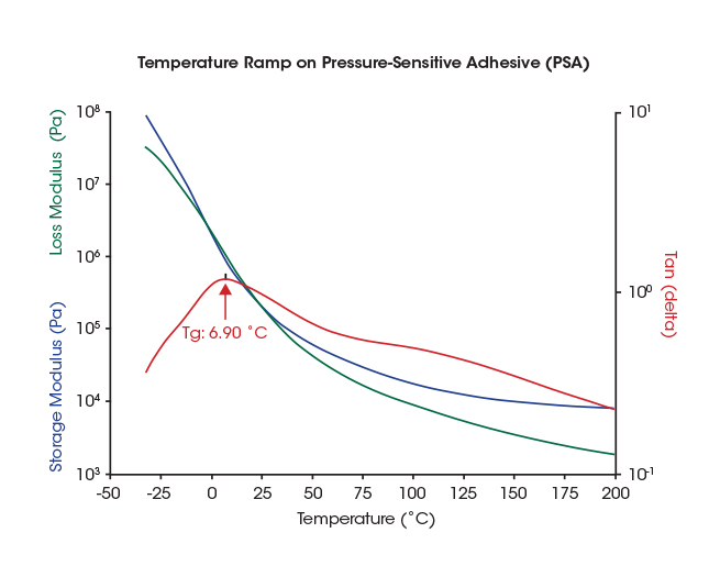 An adhesive’s success and suitability hinges on its ability to bond and resist debonding from a substrate. Measuring the viscoelastic properties, such as G’, G” and tan δ, allow users to quantify performance characteristics such as cohesive strength, tack, and operating temperature range. For example, the performance window of a pressure-sensitive adhesive (PSA) is highly sensitive to the Tg which defines the lowest use temperature of the PSA.