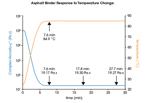 According to federal standards, a sample of asphalt binder needs to be fully equilibrated to within 0.1 °C of the test temperature prior to performing rheological measurements. In the plot shown above, the temperature quickly and accurately jumps from 25 °C to 85 °C within minutes of starting the experiment. The data further shows that as soon as the temperature is within 0.1 °C, the viscosity of asphalt binder is fully equilibrated. No change is seen in the viscosity, even after 20 additional minutes indicating that there is minimal lag between the set-point and real sample temperature. Whether programming temperature steps, ramps or complex thermal profiles to closely simulate processing conditions, the UPP’s fast and precise response reduces the time between tests resulting in increased productivity without compromising the measurement accuracy.